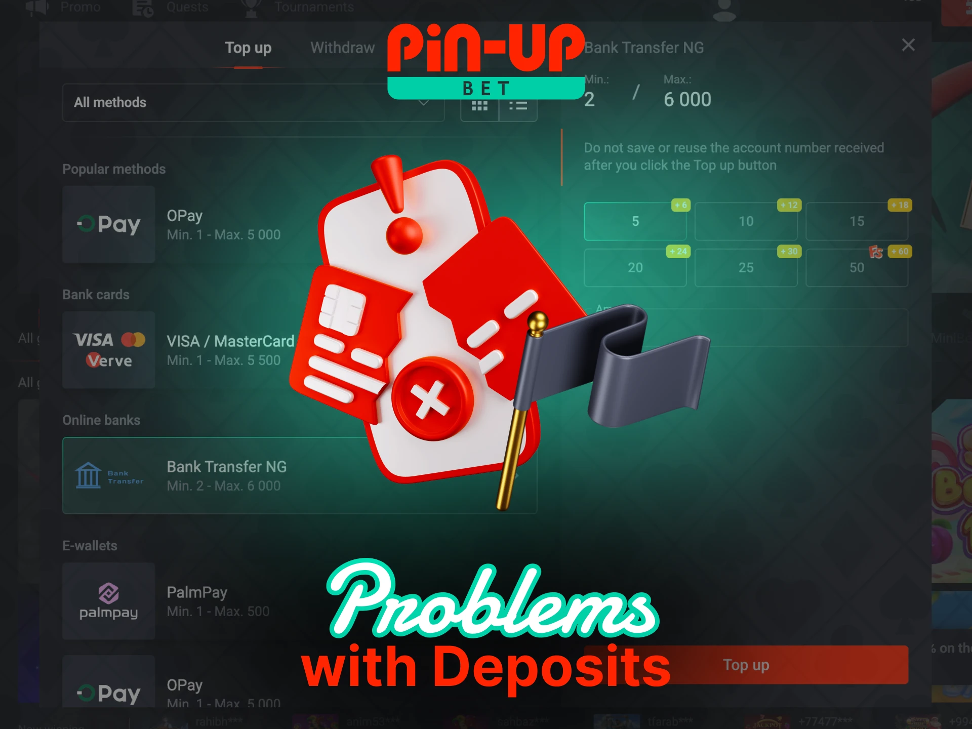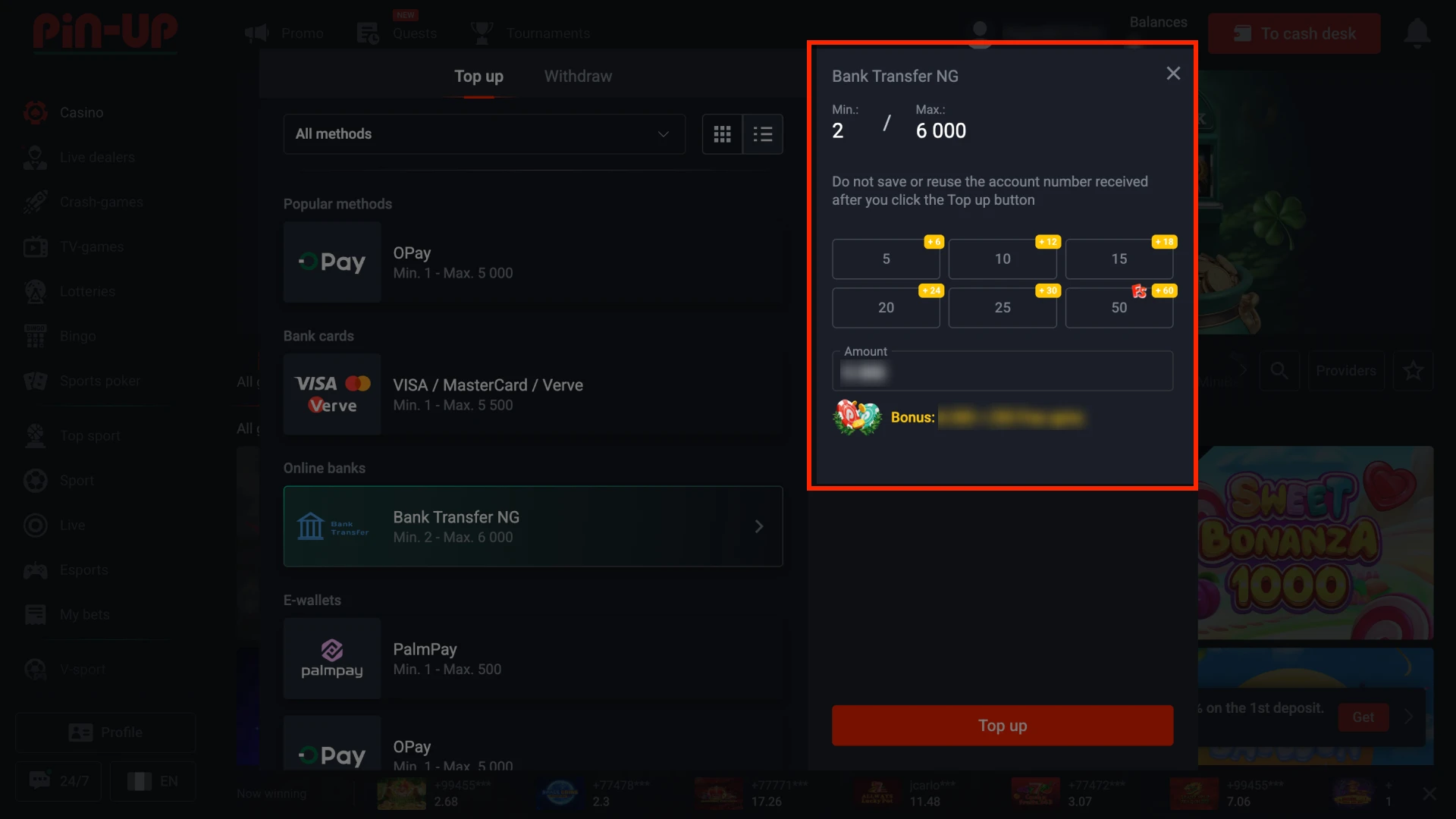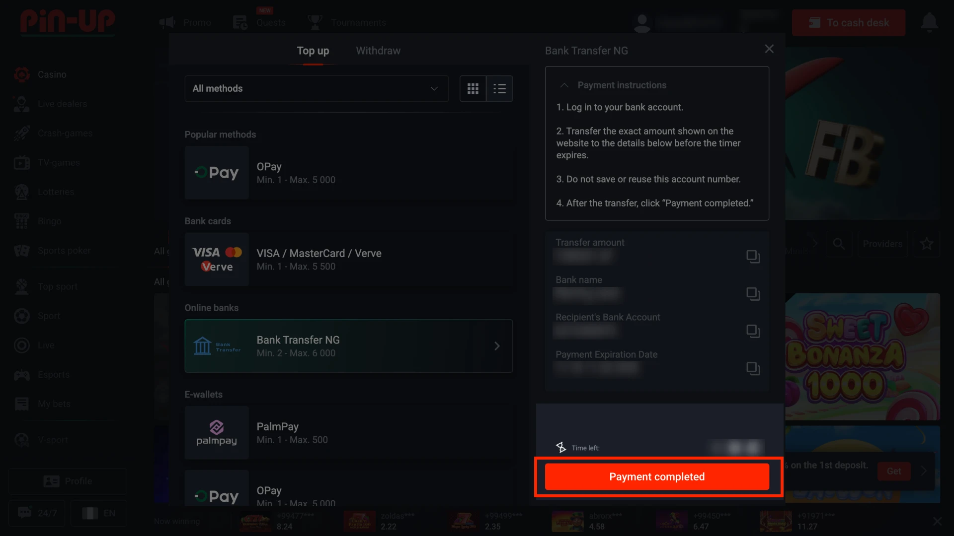 Deposits on our platform stay fast, safe, and open to users in Nigeria who want clear limits and convenient payment channels. You can fund your account through OPay, PalmPay, bank cards, bank transfers, and many crypto networks, with limits that start from ₦100 and reach up to large amounts for high-volume users. Most deposits reach the balance instantly so that you can move straight to sports or casino play, and new users can still unlock the welcome package of up to ₦8,000,000 and 250 FS after the first top-up. Start with any method that fits your budget and get started right away.